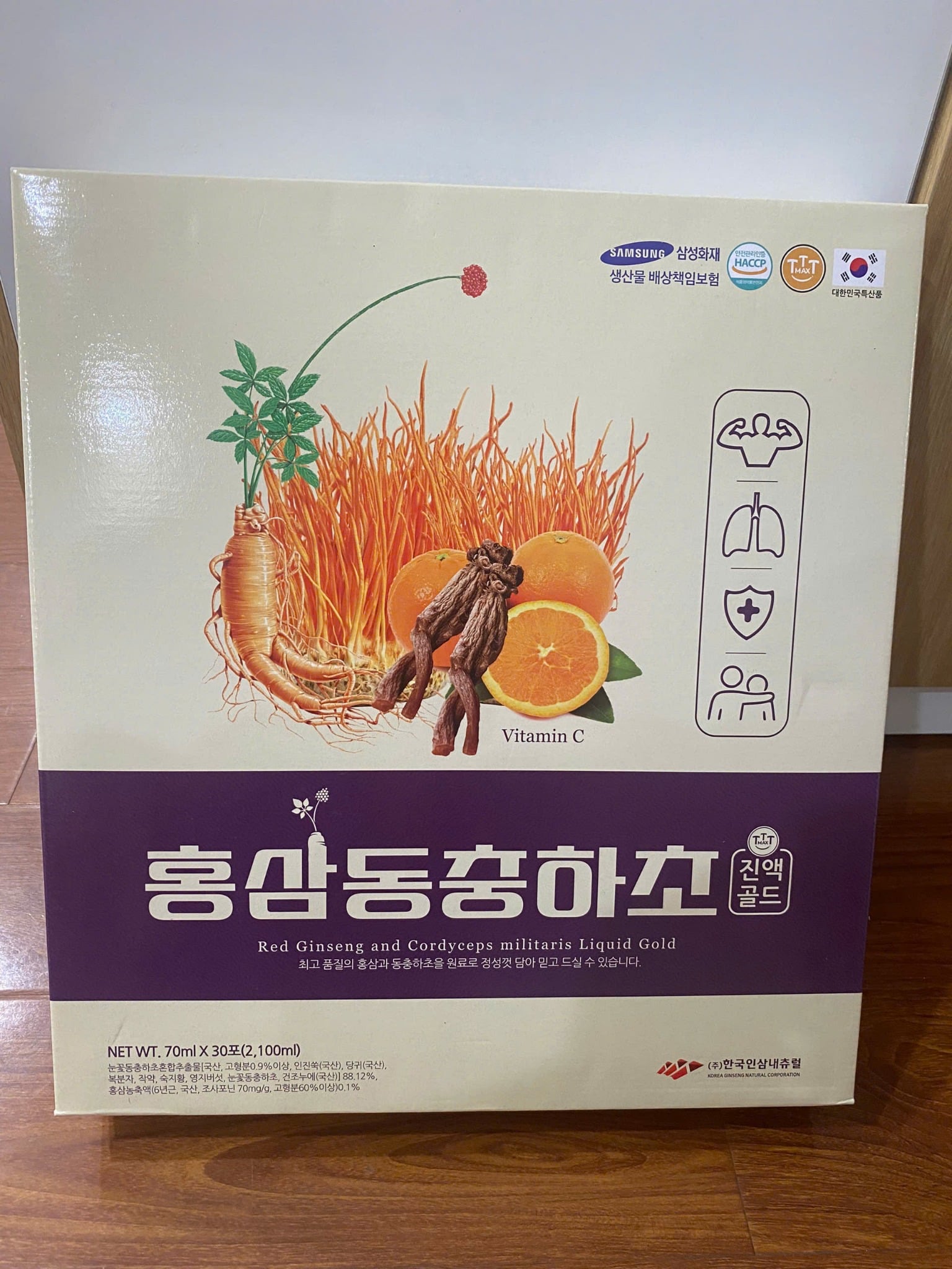 Chiết xuất đông trùng hạ thảo có tác dụng kháng viêm bổ phổi, tốt cho người tiểu đường, tim mạch, bổ thận, nâng cao sức đề kháng. Chiết xuất hồng sâm có tác dụng: Bồi bổ sức khỏe, tăng cường lưu thông máu, làm chậm quá trình thoái hóa, năng cao sức đề kháng.Chứa Vitamin C có tác dụng: Tăng cường sức đề kháng, cải thiện hệ miễn dịch