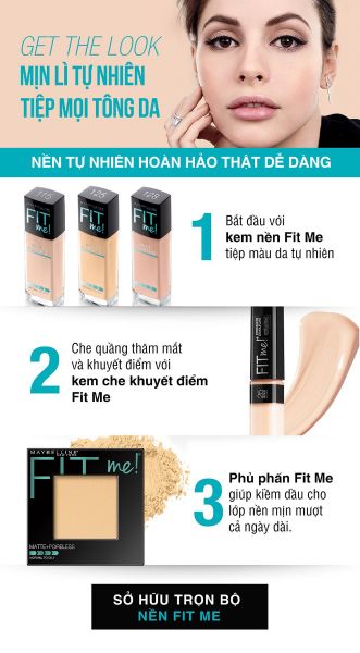 Chấm đều kem nền 5 điểm lên mặt (vùng trán, mũi, cằm và 2 má). Tán đều kem theo hướng từ trong ra ngoài. Sử dụng các bước sau để đảm bảo một lớp nền hoàn hảo lâu trôi không tì vết: Dùng Kem lót Baby Skin giúp làm mịn và mờ khuyết điểm, giúp giữ lớp trang điểm lâu hơn và mền mịn hơn trước. Sau bước kem nền, sử dụng kem che khuyết điểm Fit Me để che các khuyết điểm trên da và sử dụng tiếp phấn phủ Fit Me Matte Powder để khóa lớp trang điểm trên da. Cuối cùng sử dụng phấn má hồng Fit Me để tô điểm cho gương mặt ửng hồng tự nhiên.