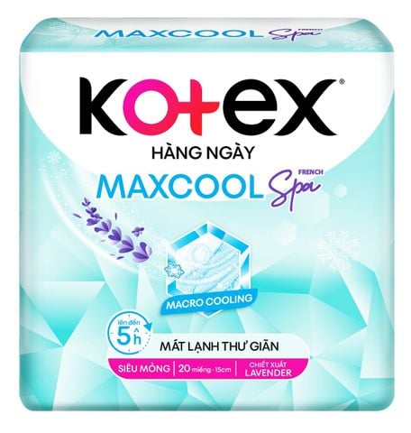 Thấu hiểu được sự bí bách, khó chịu khi sử dụng băng vệ sinh cả ngày, Kotex đã cho ra dòng Kotex Max Cool Siêu Mỏng Cánh được thiết kế với mặt lưới mềm mại, mát lạnh đến 4 giờ cho các bạn gái thoải mái trong những “ngày đèn đỏ”. Sản phẩm này được SGS kiểm nghiệm và chứng nhận là sản phẩm an toàn, thích hợp sử dụng cho những làn da nhạy cảm. Với Kotex Hàng Ngày Cool có hai dòng sản phẩm nổi bật là Kotex Hàng Ngày Cool - Dịu mát từ thảo dược và Kotex MaxCool - Hệ Cool Mới. Thế nhưng, với sự nghiên cứu tỉ mỉ, không ngừng cải tiến của mình, nay thương hiệu băng vệ sinh hàng đầu Việt Nam đã cho ra mắt phiên bản nâng cấp của dòng băng vệ sinh mát lạnh - Kotex Max Cool French Spa Siêu Mỏng Cánh 20 Miếng. Dòng sản phẩm mới này mang đến những điểm cải tiến vượt trội về công nghệ làm mát thư giãn, chiết xuất Lavender tinh tế, đầy êm dịu, nâng cao trải nghiệm của bạn gái trong những ngày đèn đỏ khó chịu.
