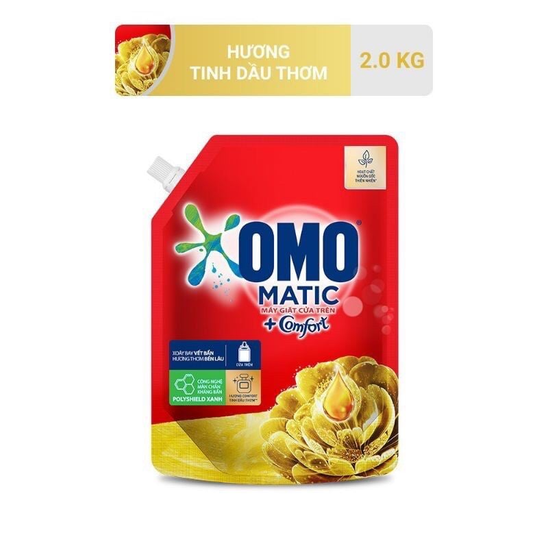 - Nước giặt OMO Matic Comfort Tinh Dầu Thơm được thiết kế phù hợp cho máy giặt cửa trên. Công thức màn chắn kháng bẩn Polyshield phủ một lớp màn chắn vô hình lên bề mặt sợi vải, khiến vết bẩn không thể thấm sâu và dễ dàng bị đánh bay khi giặt mà không phải vò tay trước.