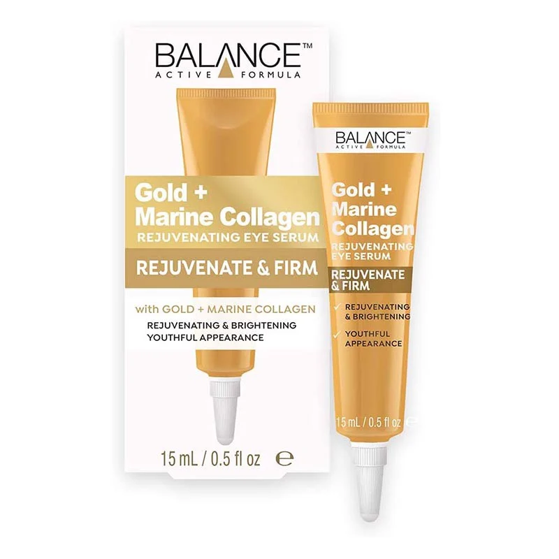 Tinh Chất Dưỡng Da Vùng Mắt Ngừa Lão Hóa Balance Active Formula Gold + Collagen Rejuvenating Eye Serum là kem dưỡng da mắt thuộc thương hiệu Balance Active Formula với thành phần chính Colloidal Gold giúp vùng da quanh mắt trông săn chắc và sáng hơn, mang lại vẻ rạng rỡ cho đôi mắt và Marine Collagen giúp làm mịn và giảm các dấu hiệu lão hóa ở vùng quanh mắt. Tinh chất dễ dàng hấp thụ nhanh và không gây cảm giác bết dính.