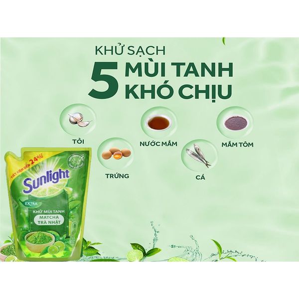 -Nước Rửa Chén Sunlight Matcha Trà Nhật đánh bay các lớp dầu mỡ mà không lưu lại mùi hóa chất, không hại da tay, an toàn bảo vệ sức khỏe cả gia đình.