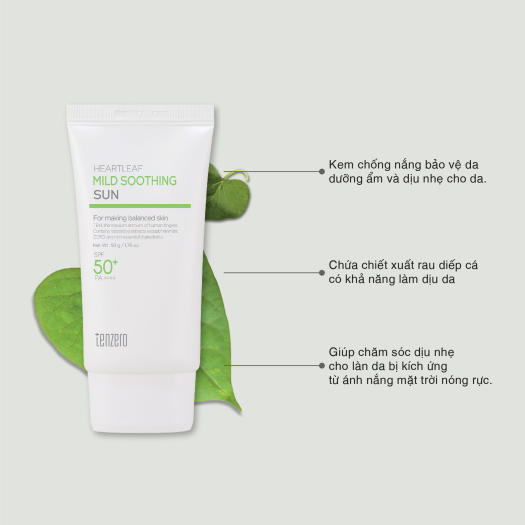- Kem chống nắng giúp bảo vệ làn da khỏi tác động từ tia tử ngoại (SPF 50+ PA++++) và chứa chiết xuất rau diếp cá chăm sóc làn da êm dịu.